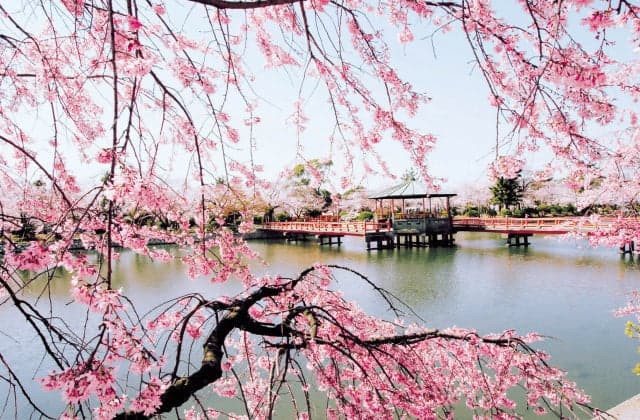 桑名城の本丸跡と二の丸跡に造られた公園で、約7.20haの広さがあります。かつて「扇城」と呼ばれ、海道の名城とたたえられた城の面影を残し、たくさんのさくらやつつじ、花菖蒲が植えられ、市民の憩いの場として親しまれています。4月の「さくらまつり」や5月の「金魚まつり」、6月の「花菖蒲まつり」など、季節に応じて多彩な催しが開かれ、大勢の市民でにぎわっています。また、園内には松平定綱(鎮国公)と松平定信(楽翁公・守国公)を祭る鎮国守国神社があります。