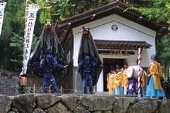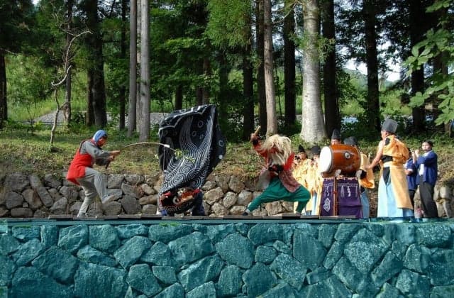 数河獅子は「曲獅子」「天狗獅子」「金蔵獅子」の三段から構成され、ユニークで独特な踊りを舞います。祭礼の1ヶ月前から村の古老が毎晩出演者の指導にあたり、その伝統を今に継承してきた歴史ある例祭です。