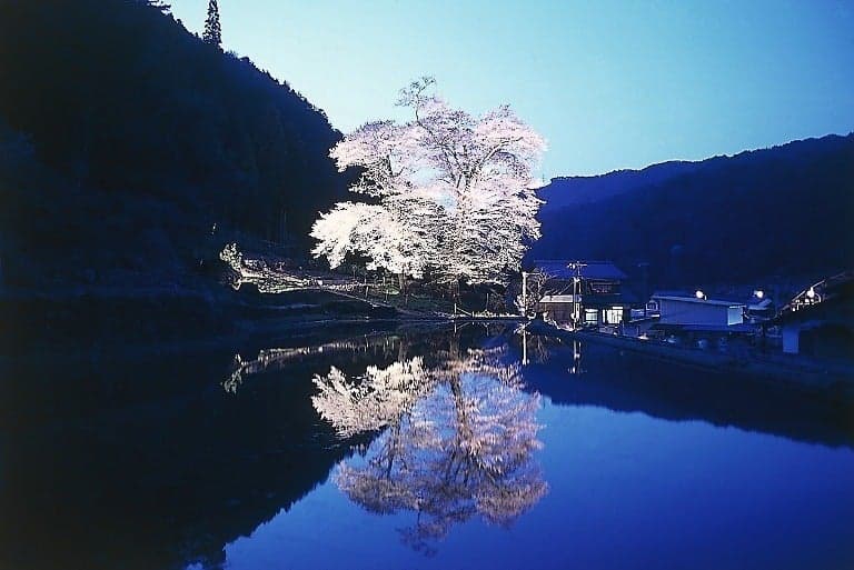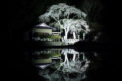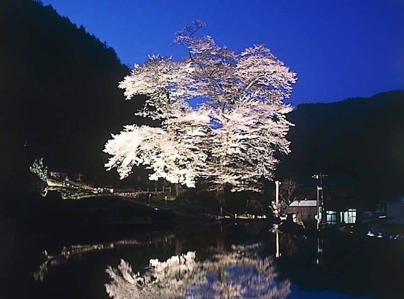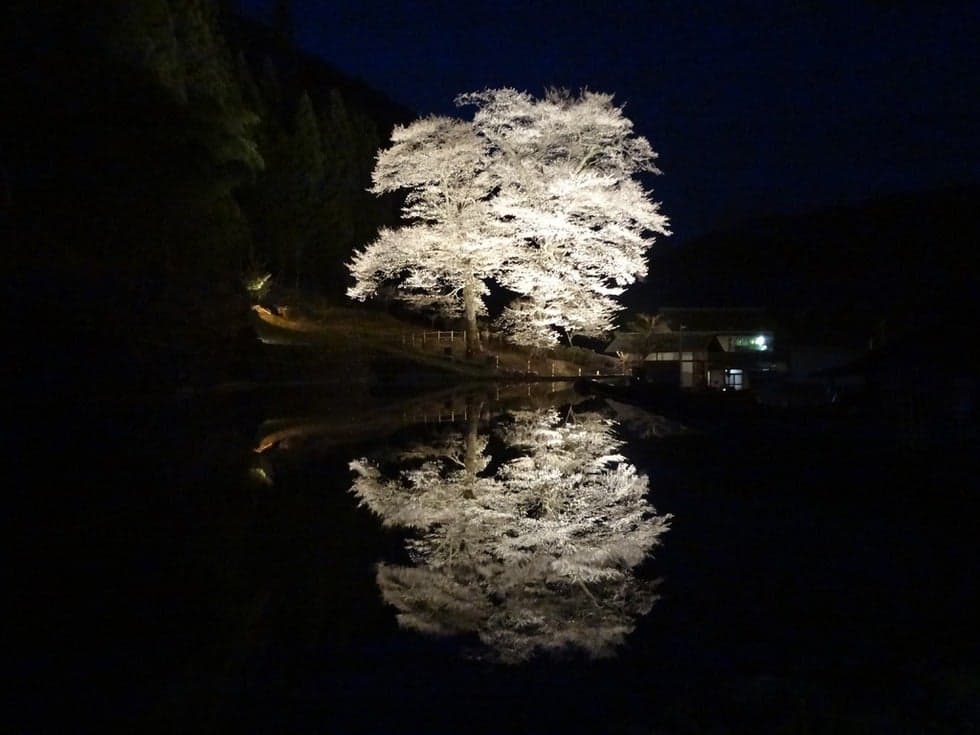 苗代桜(なわしろざくら)は、別名を暦桜(こよみざくら)ともいい、下呂市の和佐地区、大和橋を渡った小丘に立っています。その美しい桜の開花を待って里人が苗代(稲の苗を作るための田)の準備を始めたというところから苗代桜の名が付きました。2本の巨木からなり、樹齢約400年といわれています。開花時にライトアップが施され、手前にある水田に鏡のように写りこむ姿が幻想的です。見ごろは4月上旬~中旬。
