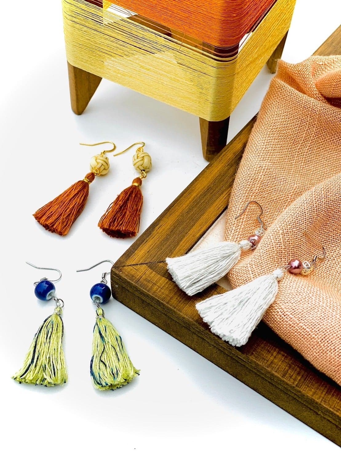 反物だけではなく、久米島紬を利用したヘアゴムやピアスなどのアクセサリーや名刺入れ、財布などの小物も販売し、文化財の久米島紬をより身近に感じることができる。