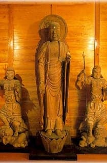 永正3年(1506年)、当時高城城主肥後文次郎盛明が、大守島津忠昌を施主として『子孫繁栄』『武運長久』『領内安穏』を祈願して建立したもので、中央に地蔵菩薩、左に毘沙門天(びしゃもんてん)、右に多聞天(たもんてん)の三体からなり、いずれも木彫で色彩が施されていた。県下最古の木仏像でその作巧妙といわれる。昭和28年に県指定文化財に指定されました。