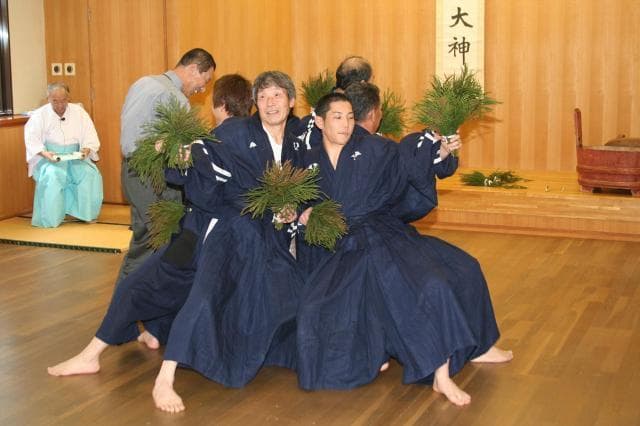 室町時代から伝わる野坂区の伝統行事です。「素襖(すおう)」を着た男衆が「田打ち歌」に合わせて「だのせのせのやー」と合いの手を入れながら、くわに見立てたチサの棒で大太鼓をたたき、田を耕す姿を表現した「田打ち踊り」を舞います。その後、「田植え歌」に変わり、福男の米蒔きや女性に扮した小昼持ち(こびるもち)などを間に加えながら、稲の苗に見立てた杉の葉を手に「田植え踊り」を舞い、その年の豊作を祈ります。