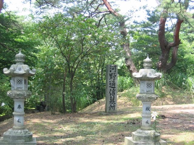 時宗の開祖である一遍(1239~1289年)の祖父、河野通信【こうのみちのぶ】(1156~1223年)の墓といわれています。通信は源頼朝に仕えた武将でしたが、承久の乱(1221年)で鎌倉幕府に敗れて平泉に流されました。ひじり塚周辺の風景は、『一遍上人絵伝』に描かれた一遍が通信の墓参りをする場面に、とてもよく似ています。