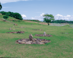 1951(昭和26)年の調査で発見され、立石をともなう配石遺構(ストーンサークル)が注目を集めました。国の指定史跡になっています。樺山遺跡は約30ヶ所の配石遺構があり、縄文時代中期の墓地および集落跡と見られます。竪穴住居も復元され、史跡公園として親しまれています。