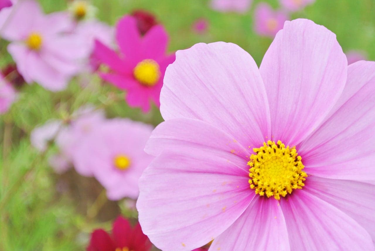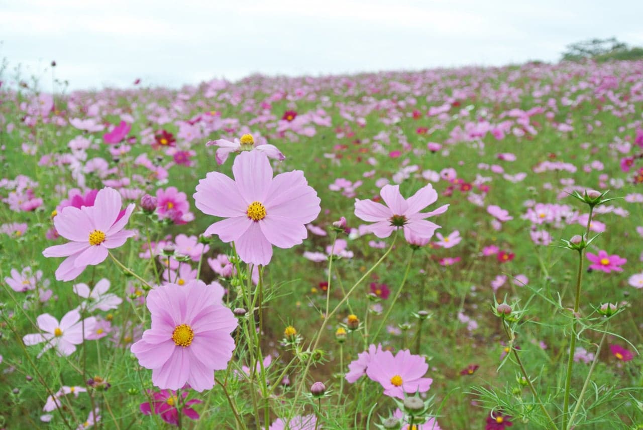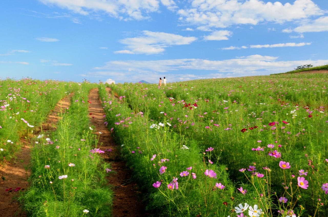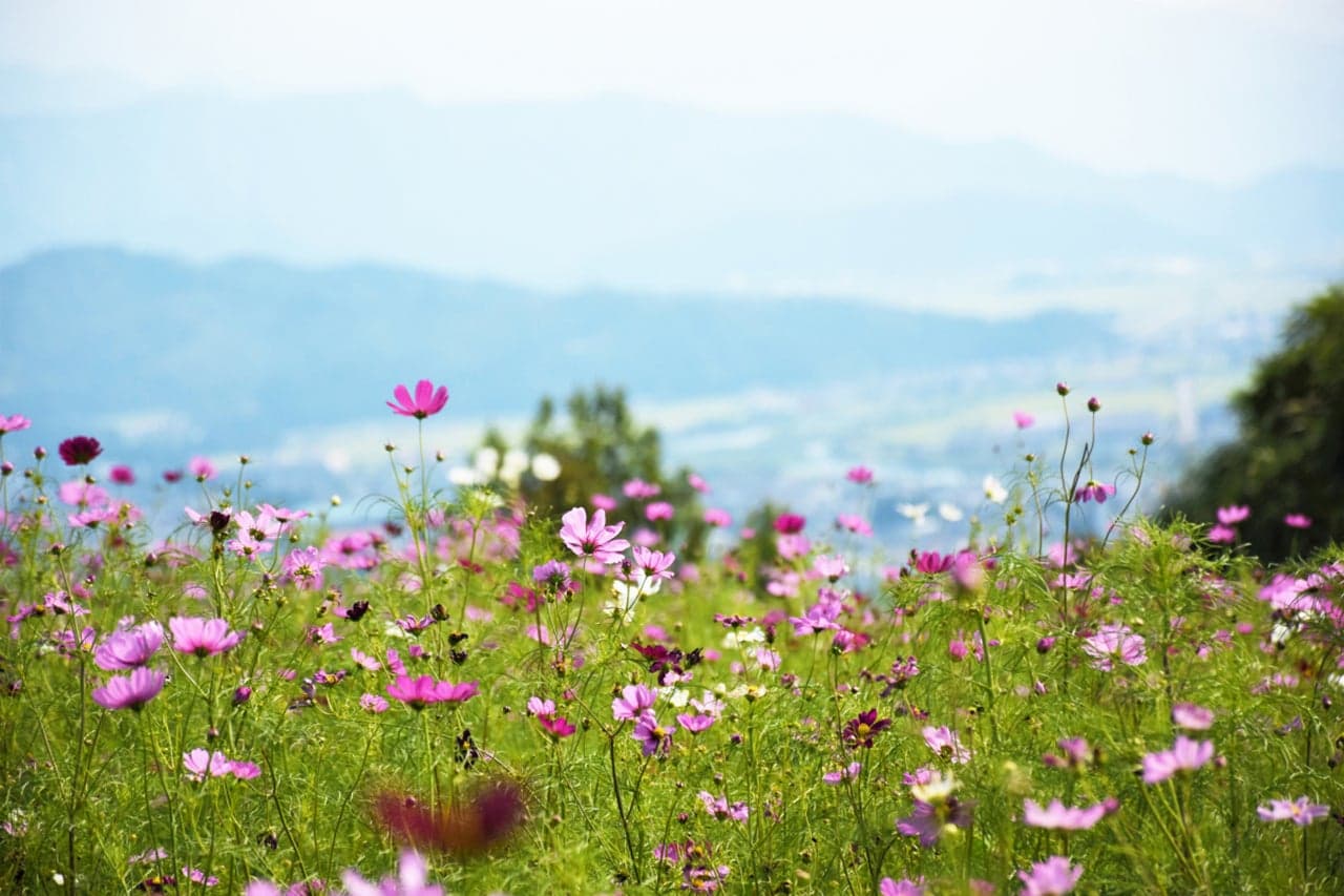 Beautiful cosmos are in full bloom on the plateau with a magnificent panoramic view