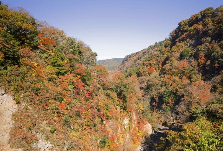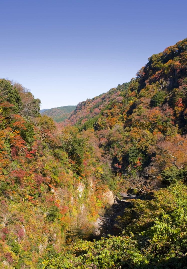 Kyusuikei is widely known as a beautiful scenic spot for rich greenery, autumn foliage, and waterfalls. Natural forest of fir and Japanese Judas stretches through the 2-kilometer sheer cliff region along the Kusu River. There are many hairpin turns, hence the nickname "thirteen curves." The location is also a known autumn foliage scenic spot. It draws a ton of spectators during the prime season around early November. Kyusuikei is also visible from Japan's No.1 Kokonoe Yume Grand Suspension Bridge and other observatories in nearby regions.