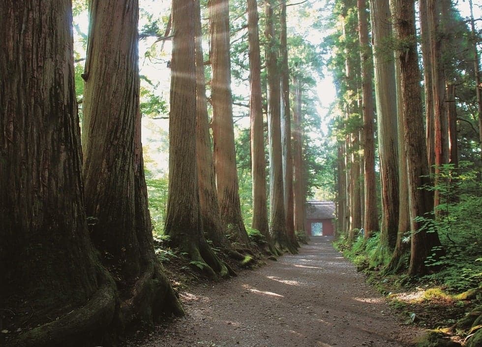 A row of cedar trees on the approach to Okusha Shrine