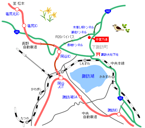 - From Nagano Expressway Okaya Interchange R20, 15 minutes via R142 bypass via R142 from Chuo Expressway Suwa Interchange R20 30 minutes via R142 via Joshinetsu Expressway Saku Interchange R142 Taxi is convenient from Shimosuwa Station on the JR Chuo Main Line. About 5 minutes. There's Azami.