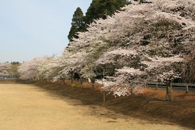 A row of cherry blossom trees (in front of Morino Stadium in Hyuga)