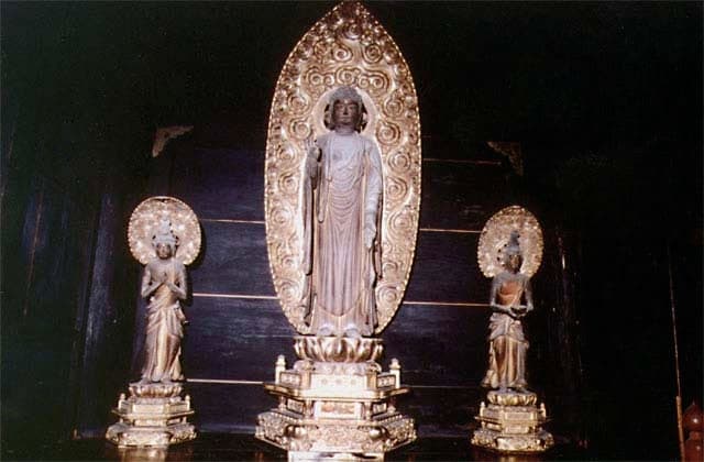 Wooden Amitabha Nyorai and standing statues of samurai on both sides