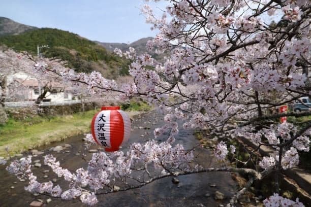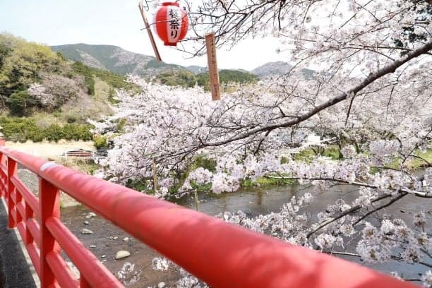 Along the banks of the Naka River in the Osawa district, a large cherry tree over 80 years old blooms magnificently, its blossoms seeming to cover the river's surface. During the season from late March to early April, the “Osawa Cherry Blossom Festival” is held. This elegant event features hundreds of bamboo strips inscribed with haiku poems submitted from across the nation, which are then adorned on the cherry tree's branches.
