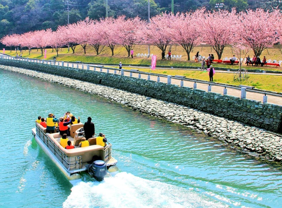 A row of Hachisuka cherry blossom trees along the Sumin River