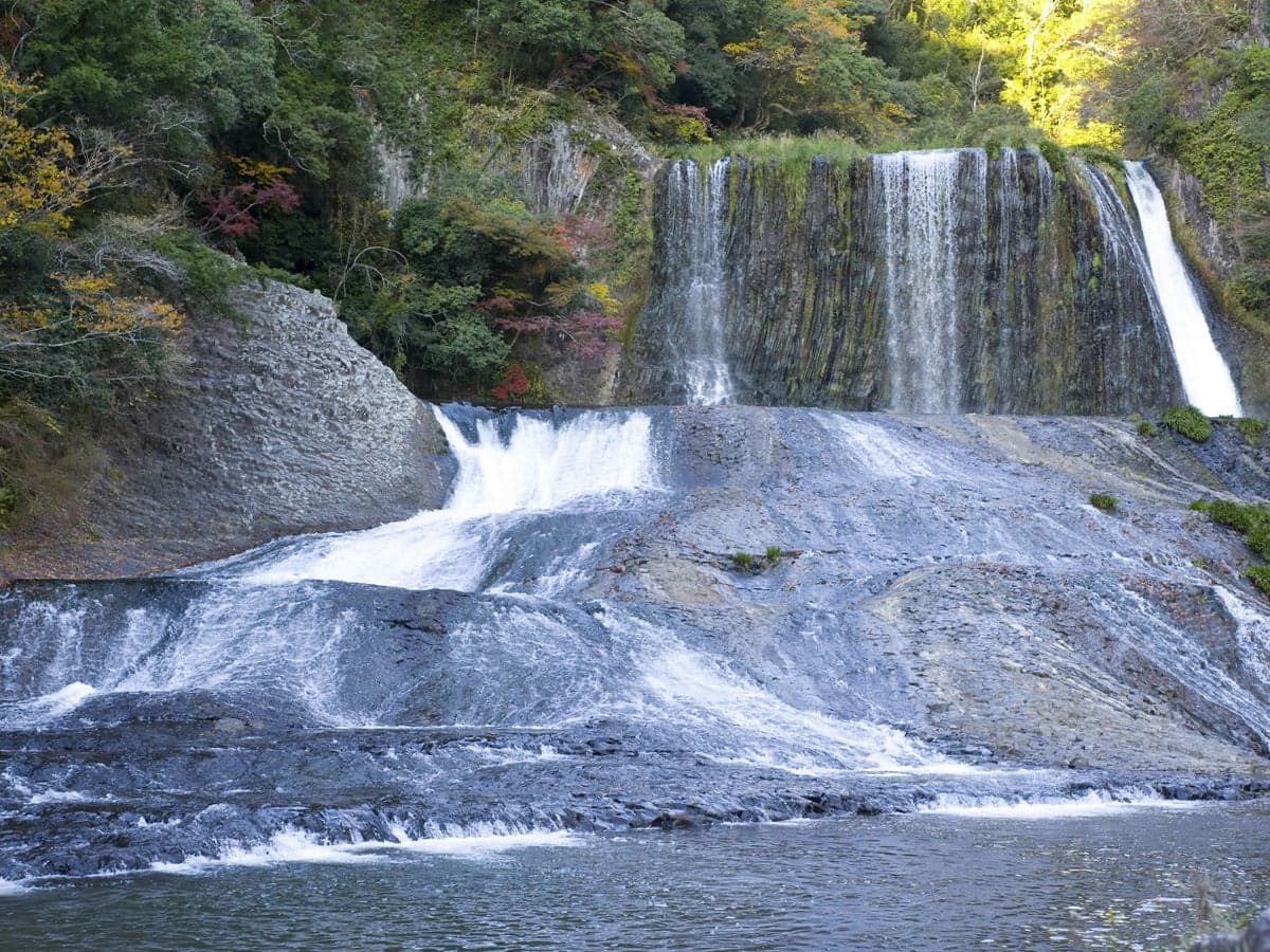 Carved out of a plateau of lava in the Chikushi region, the double-drop Ryumon Falls measures at 26 meters in height, 40 meters in width. The location is a known scenic spot for greenery and foliage in season as well as a place of natural water slide during summer. Mats for the water slide and other items are available for rent at the nearby kiosk and the campsite.