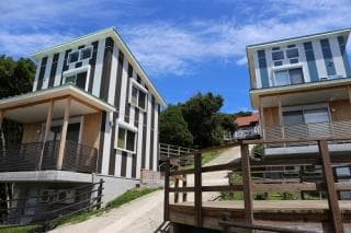 平成30年6月、崎野自然公園キャンプ場にコテージがオープンしました。全3棟で、名前はカシオペヤ、オリオン、アンドロメダ。それぞれ2階建てで、床面積約55平方メートル。宿泊に必要な設備を備え、バルコニーでバーベキューを楽しむことができます。