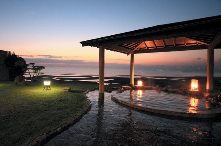 The outdoor bath, from where the Beppu Bay can be seen, has a fan-shell shape. There are two types of outdoor bath, a Japanese and Western style and each one is used by a different gender each day. Here, guests can relax while enjoying the ocean breeze. The facility also has a cascading water bath, a sauna, and a jet bath. Overall, this is a resort hotel with a tennis court, a gymnasium, and a pool with a small water slider, not found often in Oita Prefecture.