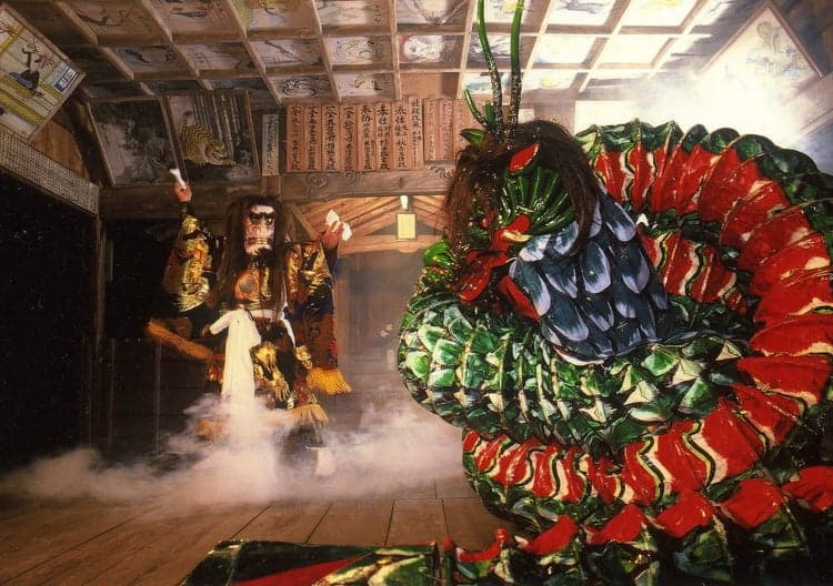 Shonai Kagura is made up of 12 different styles of sacred music and dance. It can be divided into two main styles: Shonai District style and Aso Noji style. Both have a faster tempo and festive sounds, and the drums and ohayashi flute performances are lively and exuberant as they attract the ears of spectators. A regularly scheduled kagura performances take place here at the Kagura Stage within the Shonai Athletic Park on every third Saturday between May and October. Additionally, Shonai Kagura Festival occurs in the fall and features an entire kagura troupe performance.