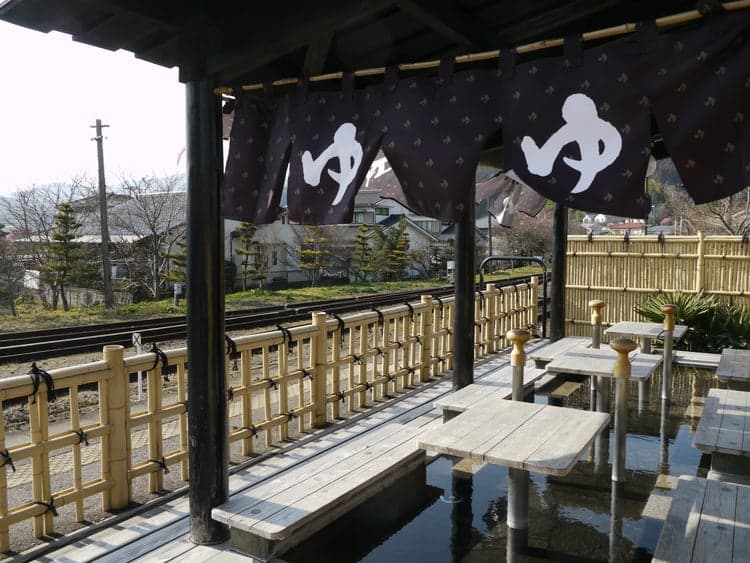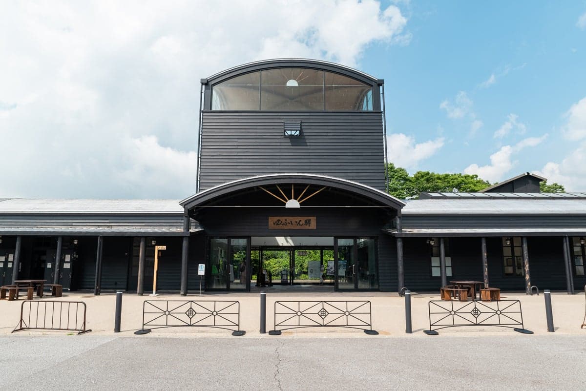 The modern wooden architecture of Yufuin Station was created by Oita-native architect, Arata Isozaki. The 12 meter high ceiling gives its lobby plenty of room, as if it is symbolic of the town's icon, Mt. Yufu. The station is also known to be one of very a few in the country without a ticket turnstile. One end of Platform 1 features a foot bath with a complementary original towel for users. Yufuin Station Art Hall on the station premises serves as a waiting room, an art gallery, a photo exhibit, a craft exhibit, and often hosts various types of special events.