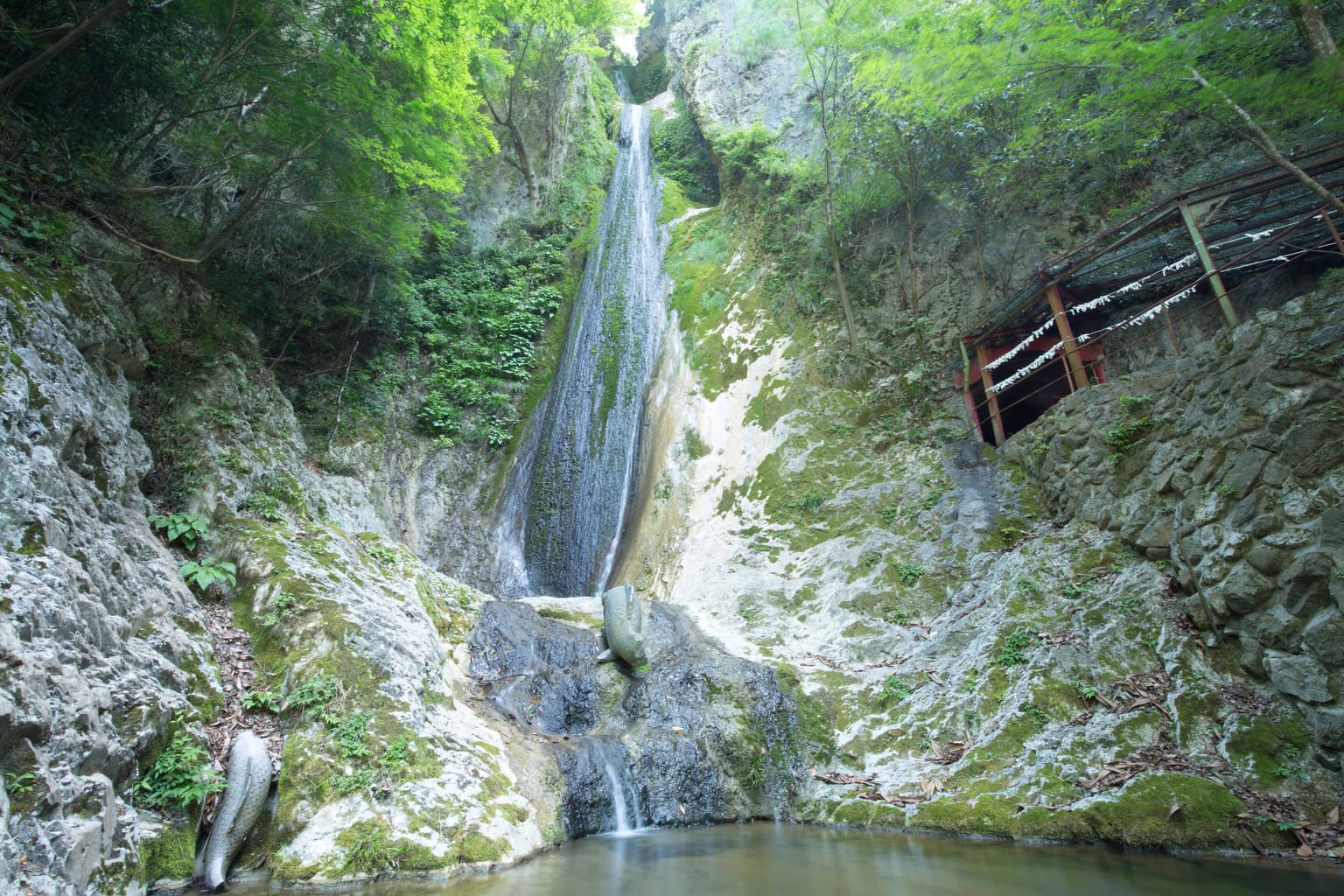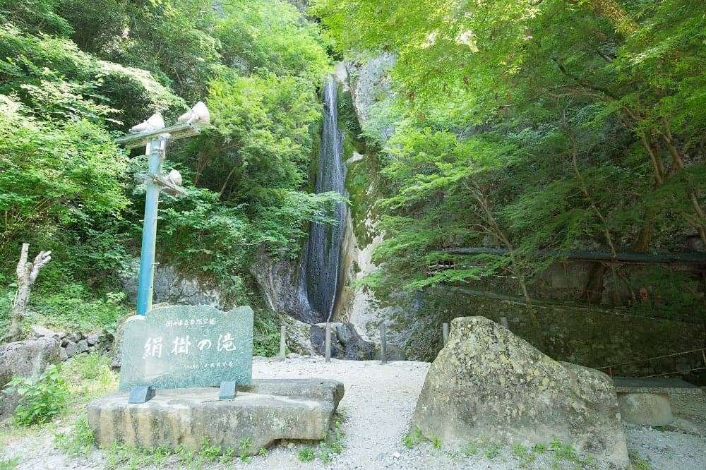 井倉峡と高梁川上流県立自然公園の中央に位置しており、周囲の景観を含めて観光の名所として知られています。井倉峡の一部としてJR伯備線や車中から眺めることができます。白い絹布を岩肌に掛けたように優雅で美しいところから、滝の名が付けられました。5月の新緑や11月上旬から中旬にかけての紅葉も見応えがあります。
