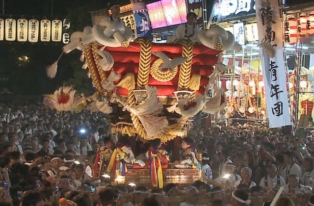 往時には、社僧48寺、社家360人、神領800町歩をもったといわれています。後白河天皇の保元3年(1158)、石清水八幡宮の別宮となり、和泉国の領主であった九州の豪族、大内氏をはじめ公武庶民の崇拝を集めていました。しかし、大阪夏の陣の兵火や度重なる災禍により、殆どの建物が焼失。同社には300年の伝統を誇る中秋の名月に行われる「月見祭」があります。「べーラ べーラ ベラショッショイ」と威勢のよいかけ声とともに、 氏子9町大小のふとん太鼓が繰り出される様子は勇壮華麗そのものです。また、境内には、府の指定天然記念物の樹齢約800年の大楠があります。