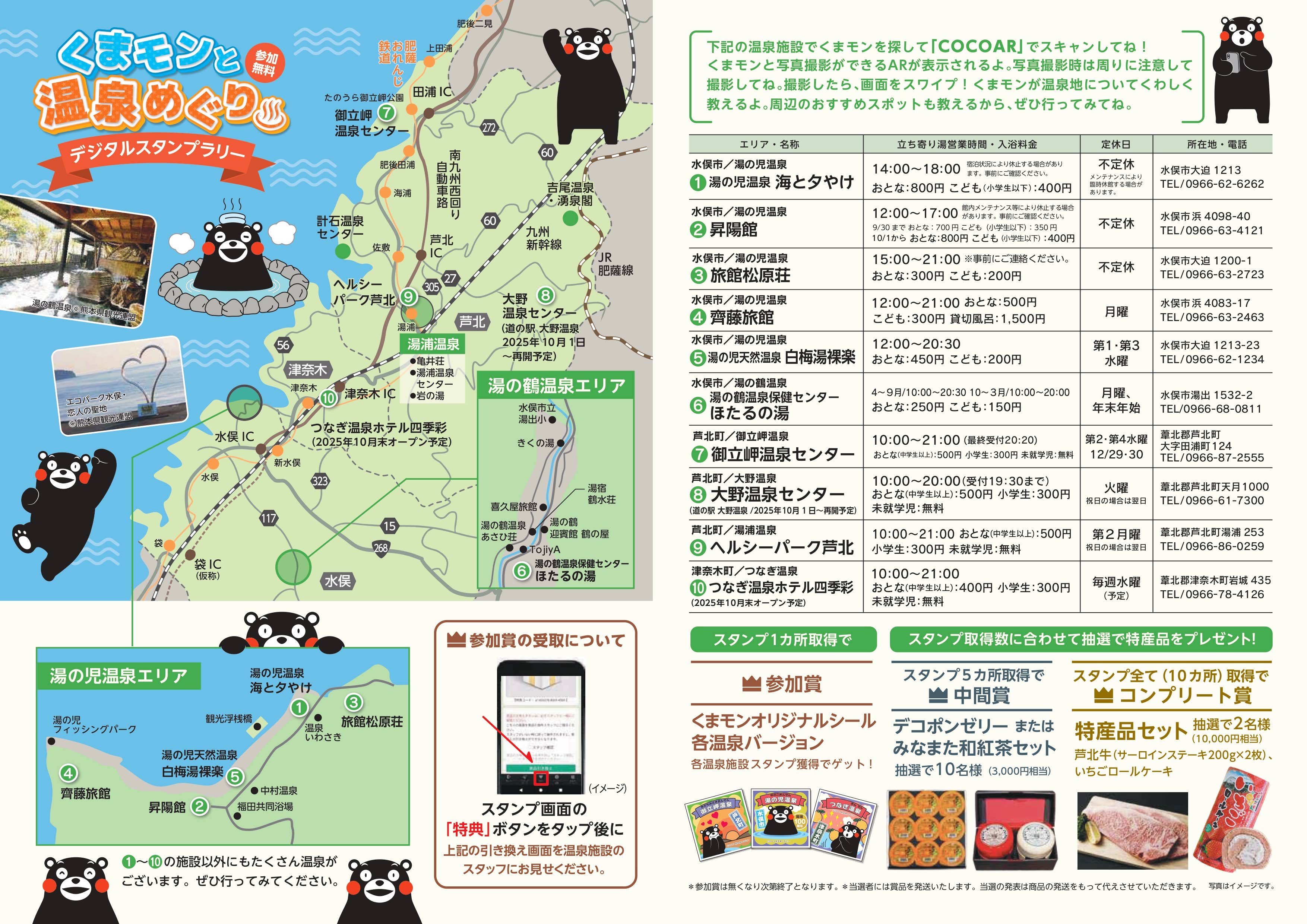 水俣・芦北・津奈木の3エリアの対象温泉施設(10か所)をめぐってスタンプを集めると、スタンプ取得数に合わせて抽選で特産品をプレゼント。