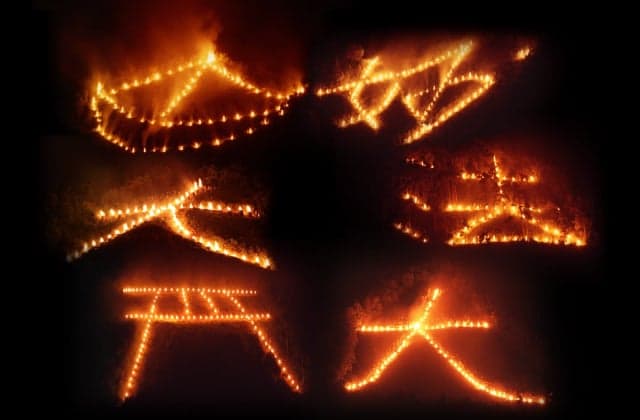 - Held every year at 20:00 on August 16. (The ignition time is about 30 minutes for each mountain. The ignition time may be changed depending on weather conditions.) Ignition time of each mountain Capital 20:00 Mystery 20:05 Ship shape 20:10 Left uppercase letter 20:15 Torii-shaped 20:20