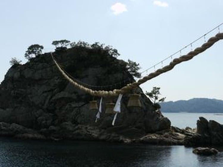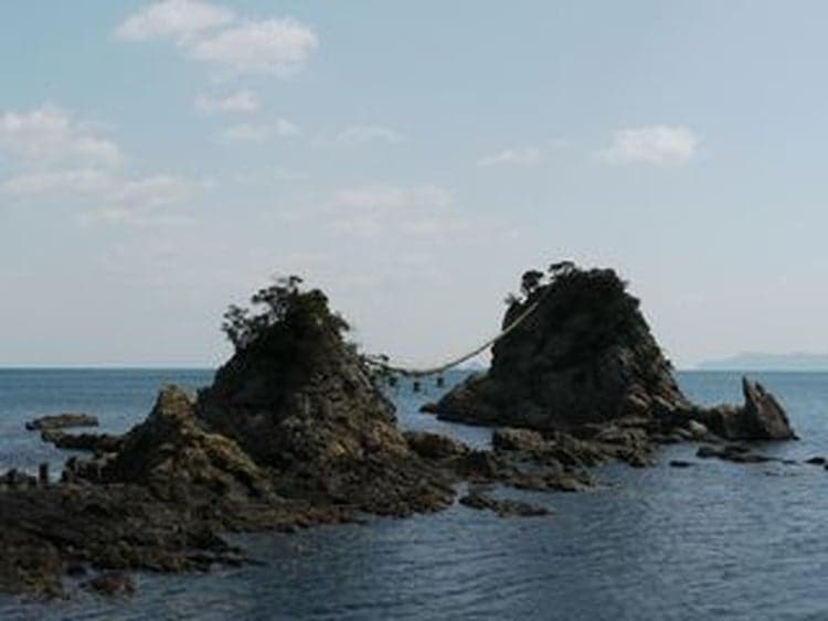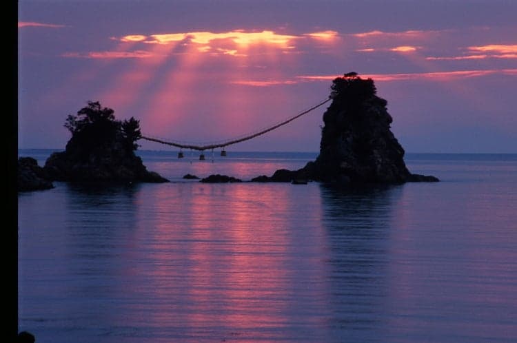 The 17m "male rock" and the 10m "female rock" of Bungo Futamigaura are linked by a 65m, 2-ton strip of Shinto consecration straw rope measuring 75cm in diameter. The symbol of Kamiura, this particular strip of Shinto rope believed to be fending off evil spirits is the longest one of its kind in the country, which consequently led to its listing in Guinness World Records in 1994. Bungo Futamigaura is also known to be a scenic spot for viewing the sunrise on New Year's Day among the natives. Between early March to early October, the sun rises right in-between the two rocks, drawing numerous spectators to the area for the early morning view.