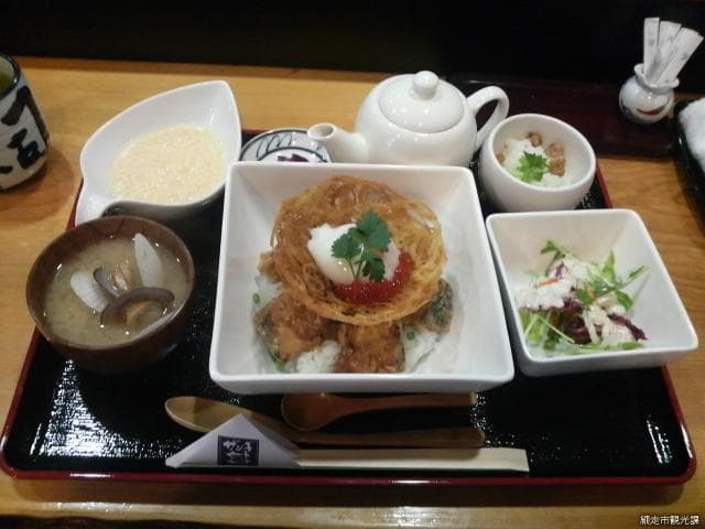 網走産のオホーツクサーモン(カラフトマス)を天然の白魚醤油に漬け込んで揚げた「網走ザンギ」がのったどんぶりです。