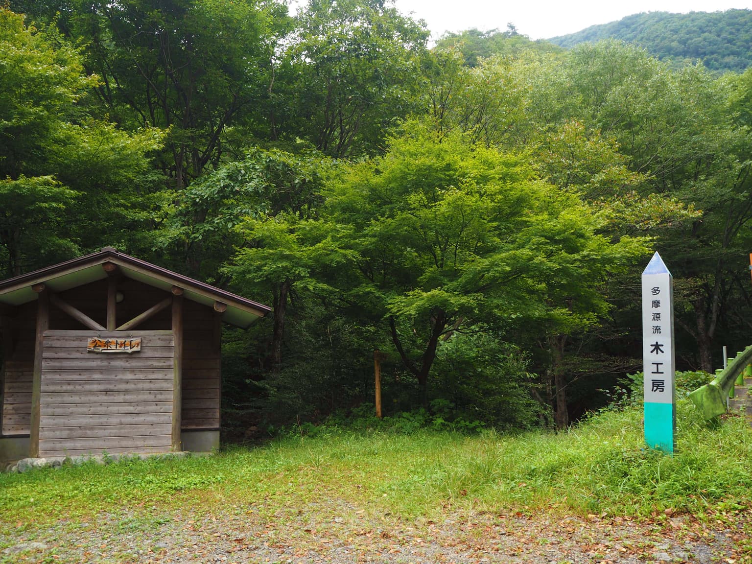 滝の入り口は「多摩源流木工房」という小屋があり、その小屋の前に車を駐車します。