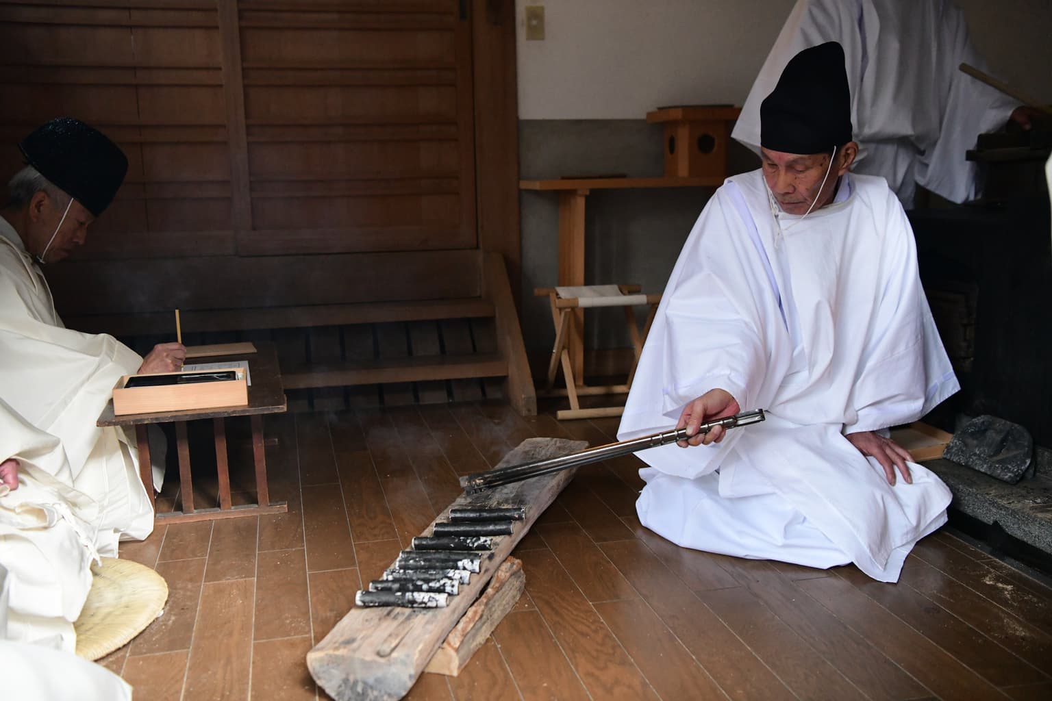小正月の年占いの一つ。小豆粥が炊かれた大釜の中に53本の竹筒を入れて、竹に入る粥の量で作物の豊凶を占います。さらに12本の樫の木をかまどにくべ、その焦げ具合で天候を占います。