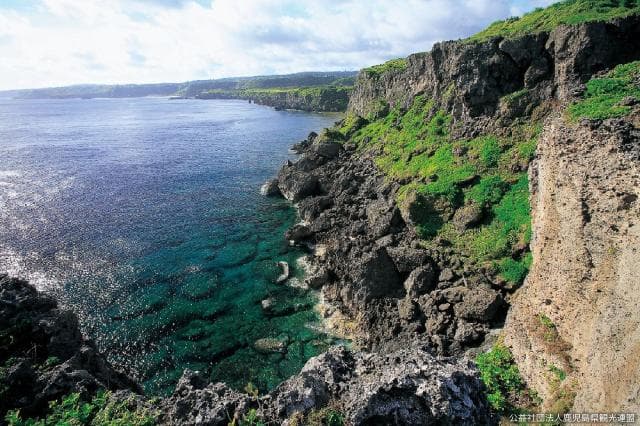 島の北西端。黒潮に浸蝕され隆起した40mの断崖。奄美十景に名を連ねる島内でも屈指の景勝地。天気のいい日には、眼下に広がるサンゴ礁群と波の合間にウミガメの姿を見ることができます。また、岬の奥には奇岩群が広がるカルスト台地があります。