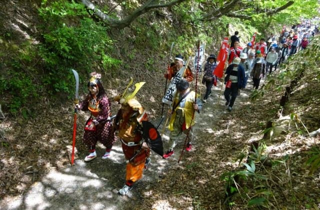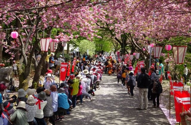 倶利伽羅古戦場で源平合戦にあやかり、長さ120メートル、太さ12センチの大綱を、津幡町と小矢部市の参加者で引き合う「加賀VS越中 源平大綱引き合戦」が開催されます。大綱引き合戦の後は、八重桜が咲き誇る歴史国道「北陸道」を、倶利伽羅山頂から武者行列とともに峠道を下ります。途中、龍ヶ峰(りゅうがみね)城址公園では団子やお茶のサービスがあり、観光ボランティアガイドによる史跡の説明もあります。