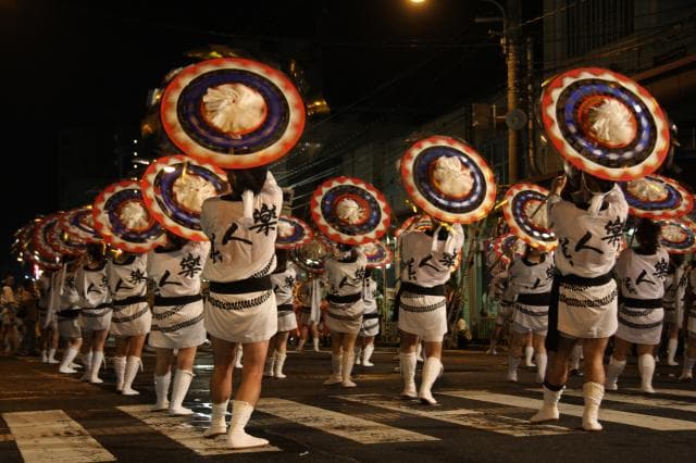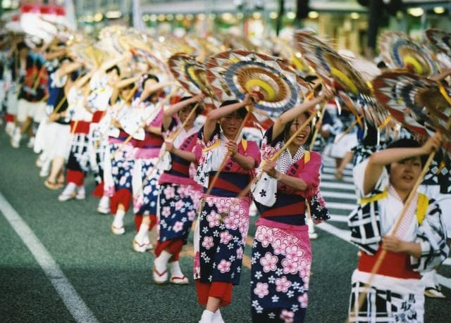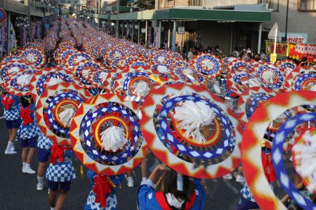 鈴の音の中4,000人による「しゃんしゃん傘」の舞いが、鳥取駅前を祭一色に染める鳥取の夏の風物詩。メインイベントの一斉傘踊りは、約4,000人の踊り子が「しゃんしゃん」と鈴の音を鳴らし舞い踊ります。華やかな傘を手に鳥取の街道を埋め尽くす姿は圧巻です。