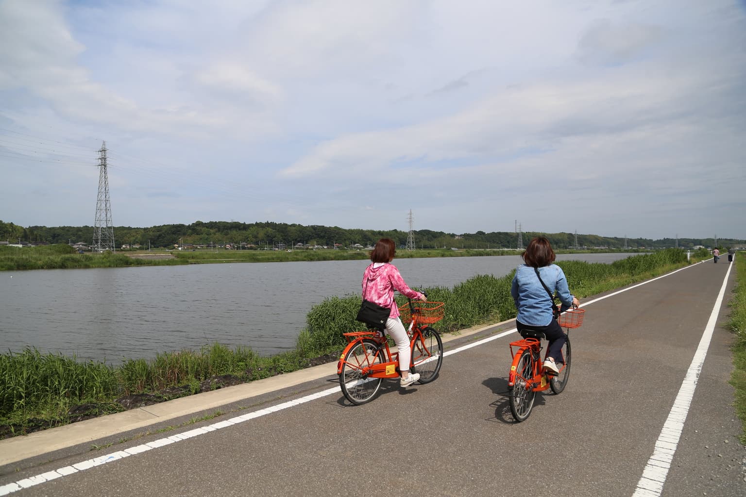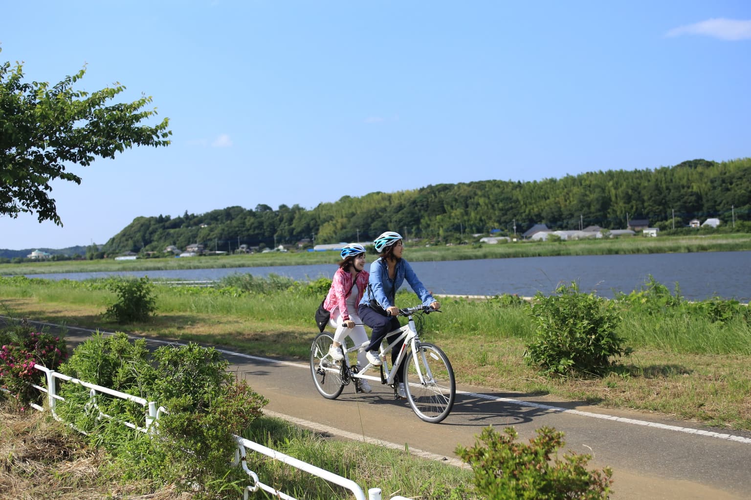都心から40km余りという近さがウリの印旛沼自転車道。左右に広がるのどかな田園地帯を見る限りでは、とてもそんな距離とは思えないほどです。さわやかな風を、胸いっぱいに吸い込みながらのサイクリングで、身も心もリフレッシュできます。
