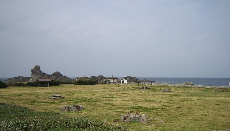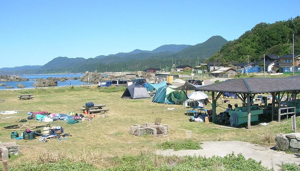 細かい砂利浜で透明度の高い入崎海水浴場に併設されたキャンプ場。車の乗り入れはできませんが、無料駐車場があります。磯遊び、釣りなどが楽しめる岩場もあり、バリエーションに富んだ自然が魅力です。キャンプサイトは開放的なロケーションゆえに樹木はなく、日除けに注意が必要です。