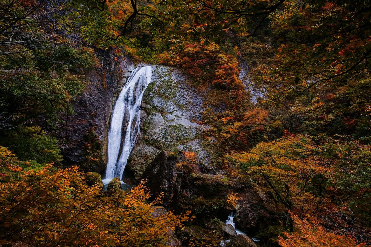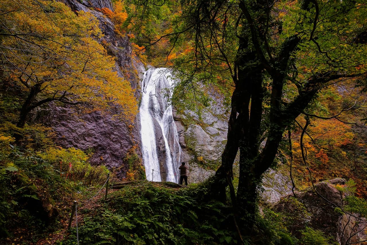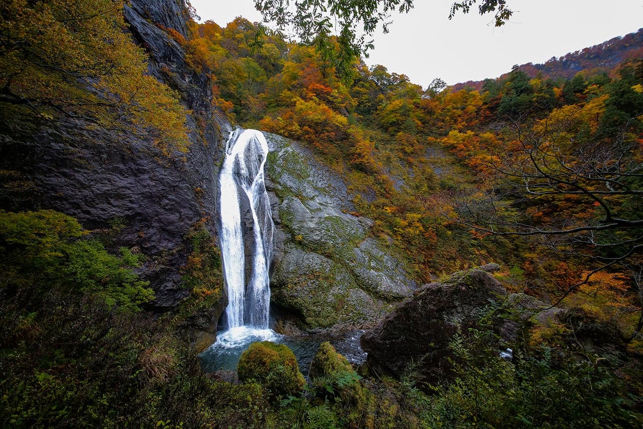 その昔、源義経公が奥州に向う際、駒を止めて鑑賞したと伝えられる鈴ヶ滝。ブナ林の歩道450m、落差55m・幅10mの爆風豪音は壮観です。