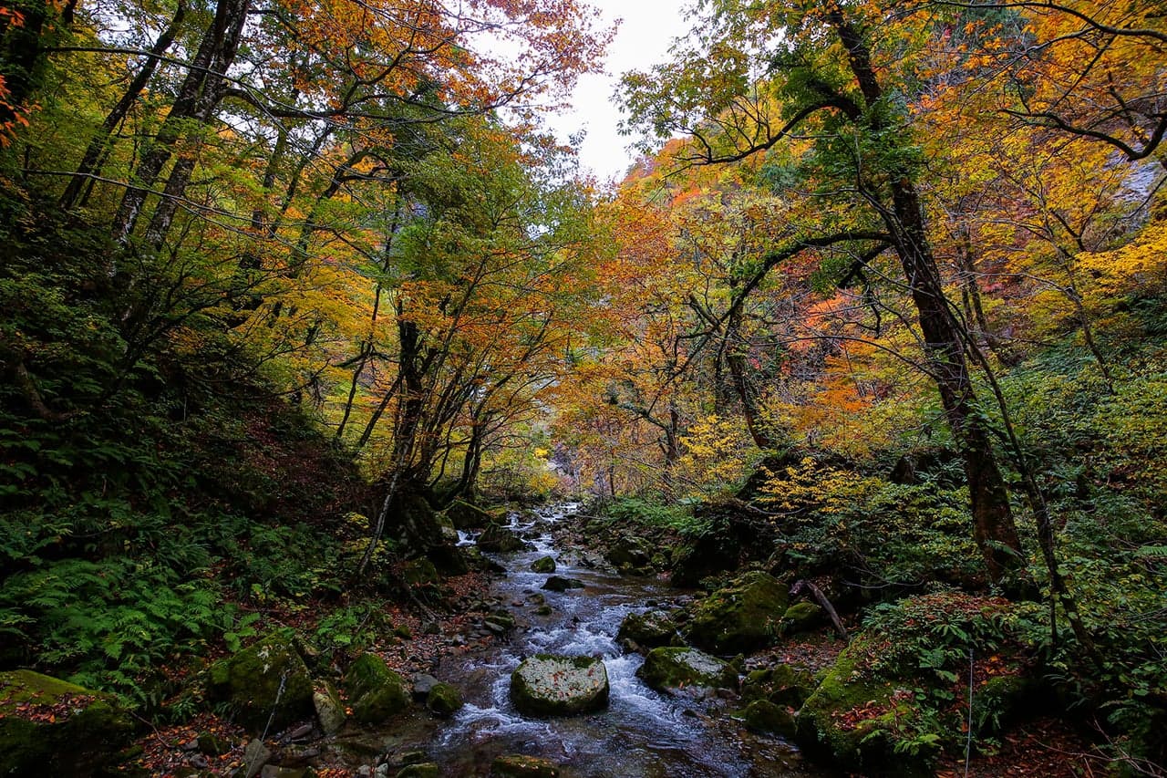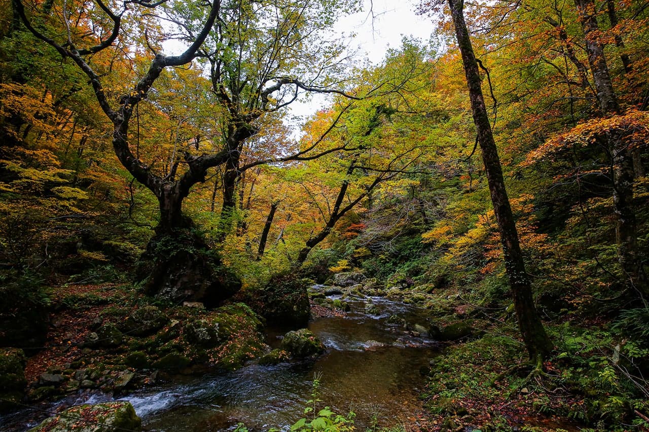 また、ブナ林の歩道の途中に姿を現す落差38m・幅5mの小滝は、その優雅さから滝の貴婦人ともいえる存在である。この二滝を中心に形成される鈴谷渓谷は、岩肌をむき出しにし、荒々しく変化に富んでいます。