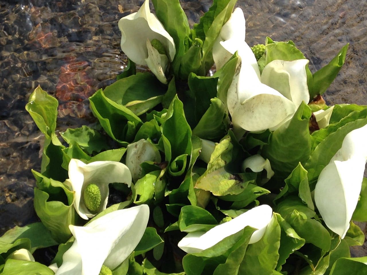 園内の小川には水芭蕉が咲き、一足早い春を誘います。