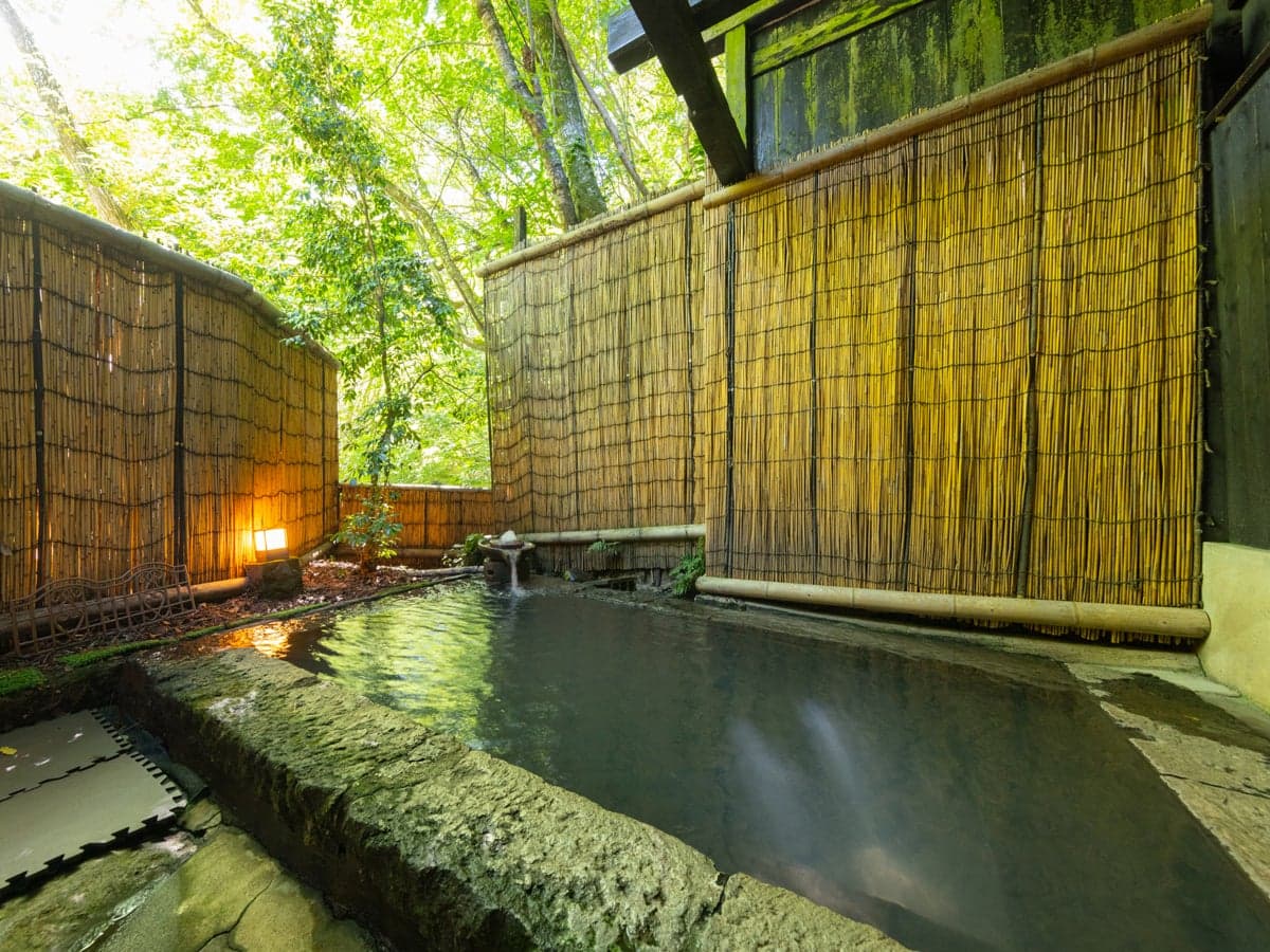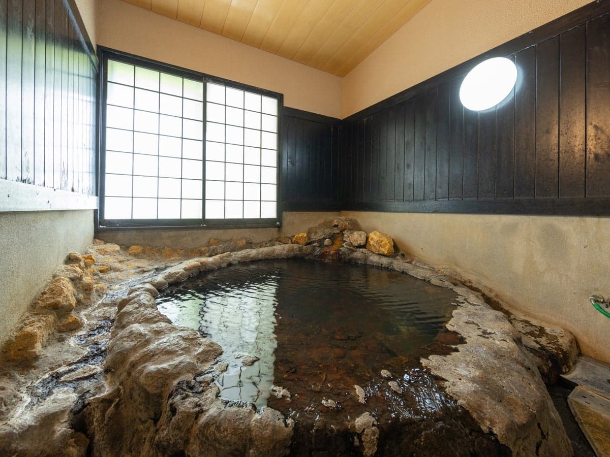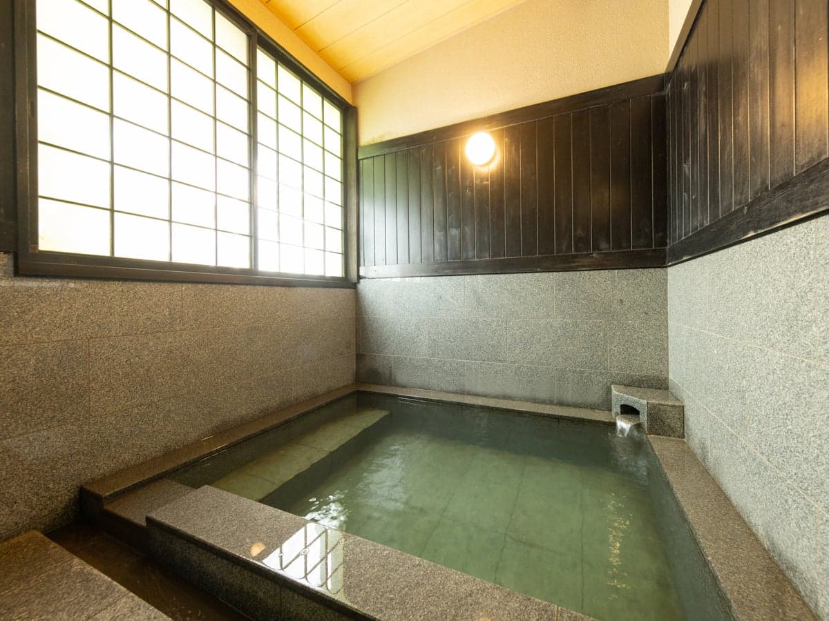 湯船の種類は、蔵を浴場に改装した露天風呂が1つと、ひのきなどを使用した内風呂が3つ。中でも水に濡れることで色合いやその表情を変える希少な天然石・十和田石や、光沢のある御影石を贅沢に配した「碧の湯」は令和7年5月にリニューアルを終えたばかりです。透き通ったお湯は肌に優しく、多くの人がその効能に「翌朝の体が軽くなる」と実感しています。