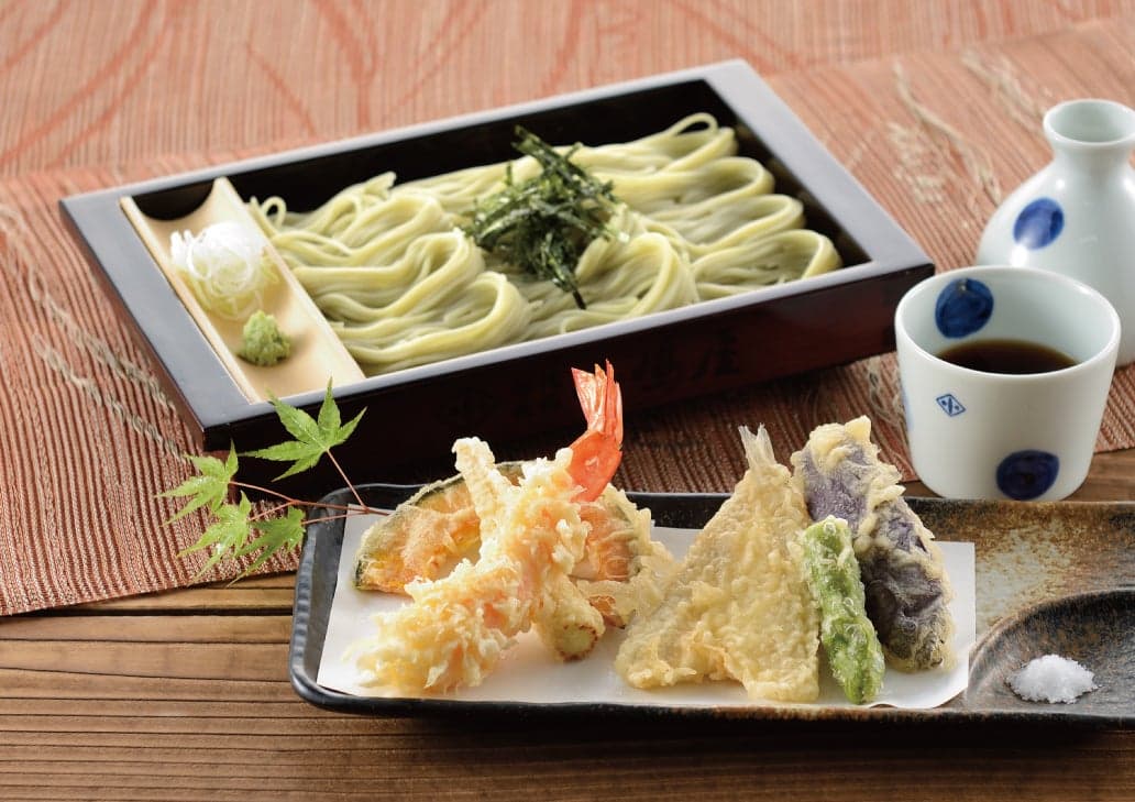 人気メニューの「天へぎ」は、独特の器「へぎ」に「手振り」で盛り付けたへぎそばに、海老や季節の野菜などの天ぷらを添えたもの。のど越しの良いそばとカラリと揚がった天ぷらの絶妙なハーモニーをお楽しみください。