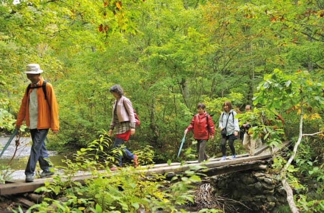 大小様々な滝やグリーンタフの上を流れる川面を眺めながら巡る散策路です。