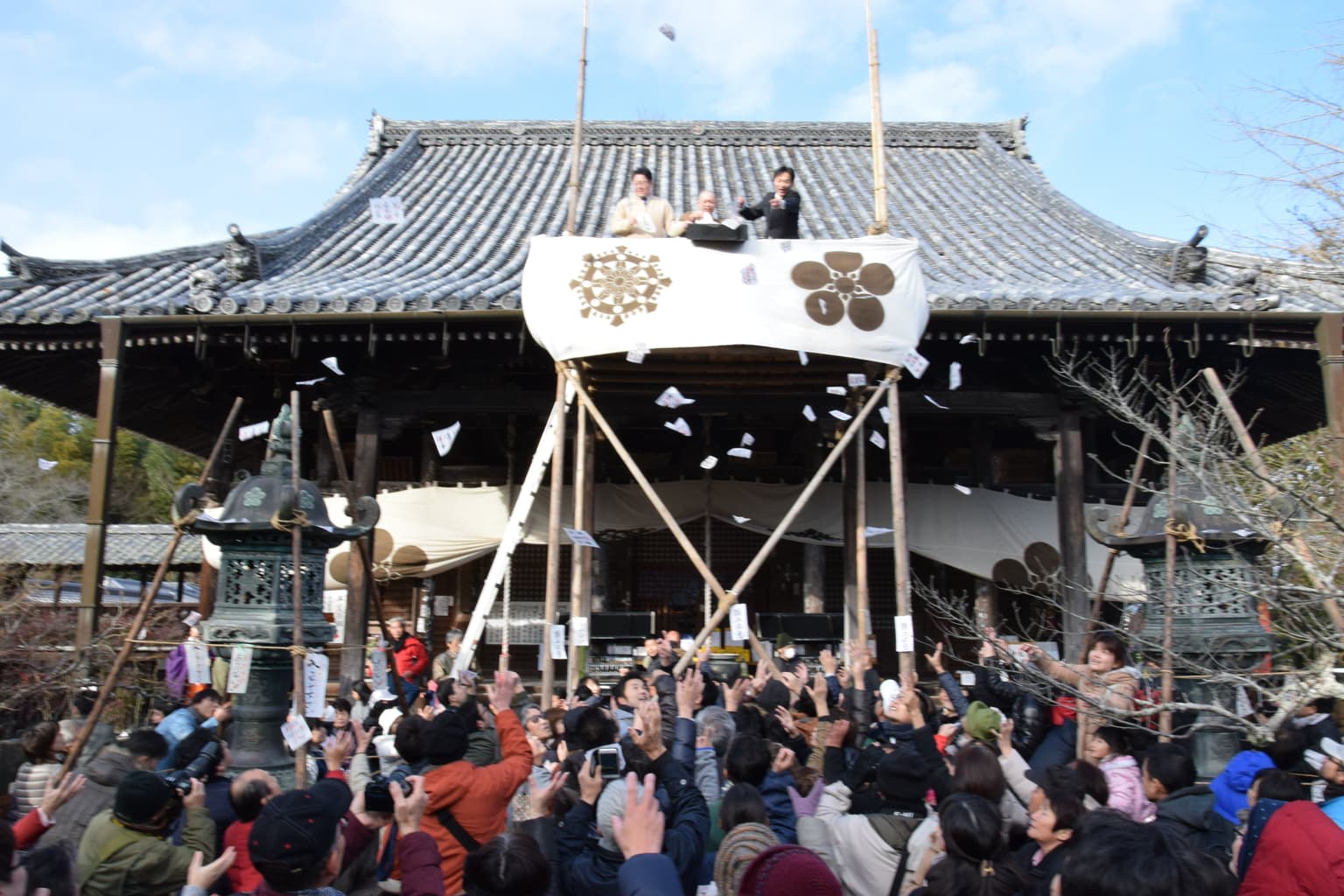 法要のあと、本堂の屋根からうちわの風によって3,000枚の福札が撒かれます。その中に3枚の赤札が混じっており、それを手にすると一年の幸を授かり、災いから逃れられる、長者になるともいわれています。また、福札をたんすに入れておけば、衣装もちになるとも伝えられます。