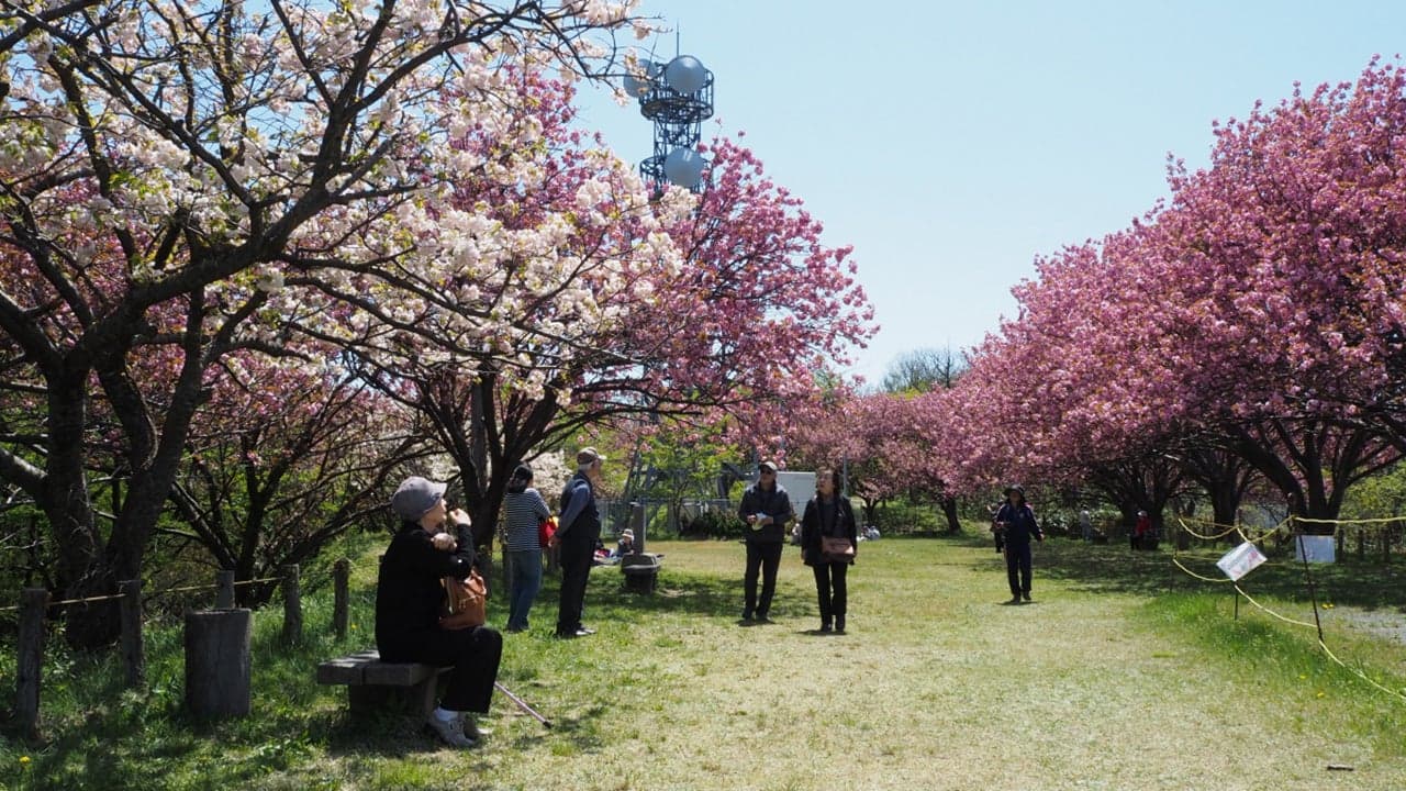 春になると、ソメイヨシノと八重桜の約500本の桜がゴールデンウィーク頃まで咲き誇り、花見に来た人たちの目を楽しませます。