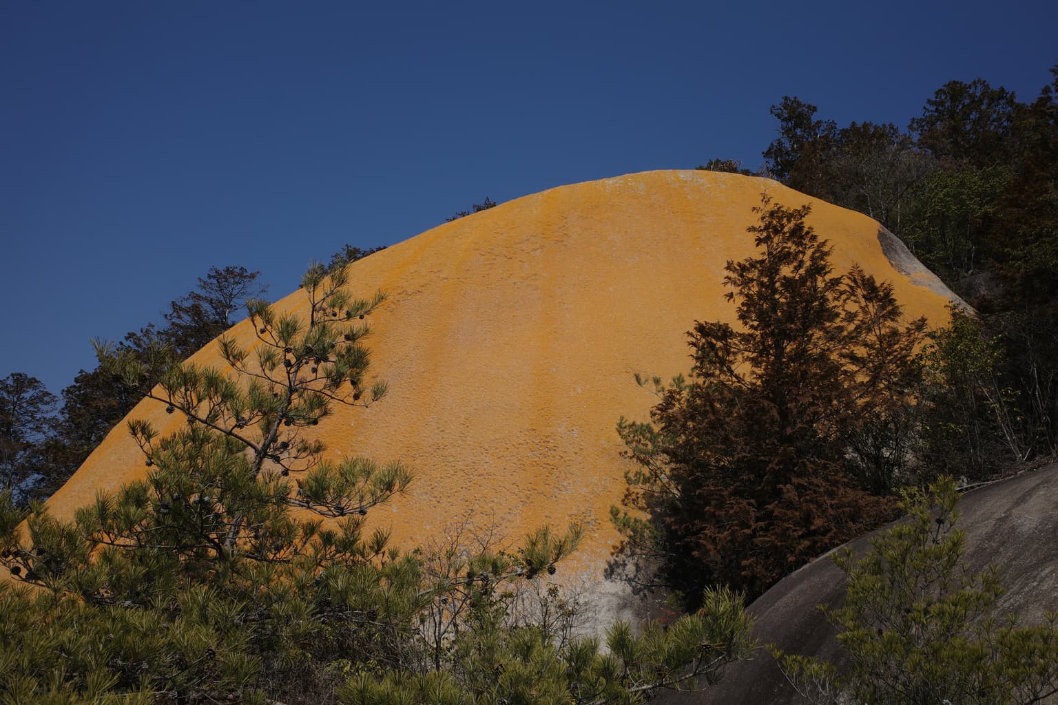- 都道府県指定天然記念物 赤く見えるのは地衣類でダイダイゴケ属の一種といわれています。珍しい種類のコケ。