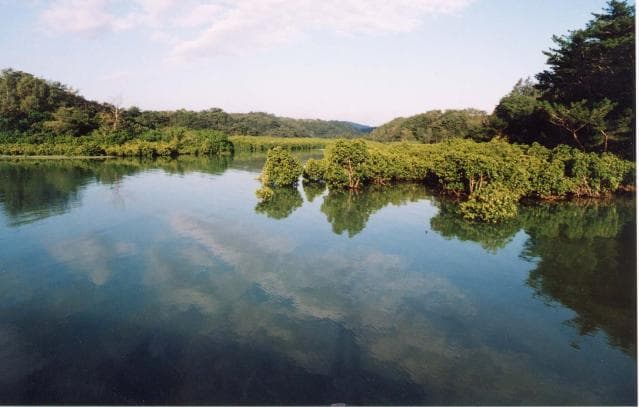 慶佐次湾のマングローブ林は、沖縄本島では、最も広く、本島で見られる4種類のマングローブ植物のうち3種類が見られる。中でもヤエヤマヒルギは、ここが分布の北限地である。また、国の天然記念物にも指定されており、遊歩道や展望台も整備されている。 駐車場20台・大型バス3台 トイレ有り