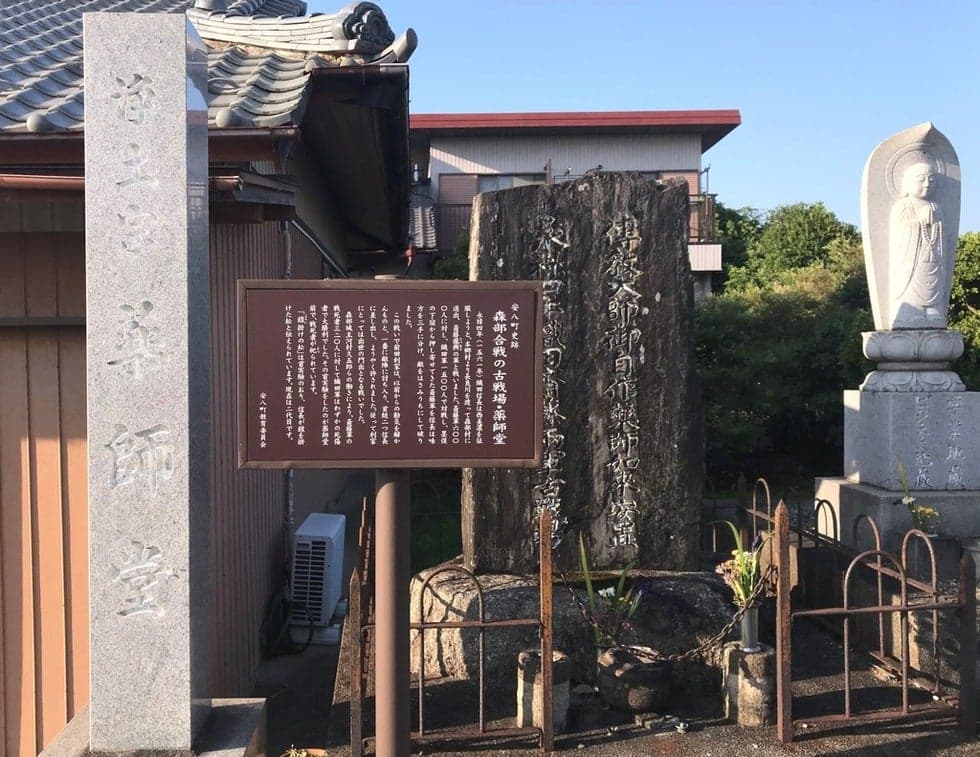 永禄4(1561)年、織田信長は西美濃を征服しようと、本郷村より長良川を渡って森部村に進出、斎藤龍興の軍と戦いました。斎藤軍6千に対し、織 田軍1万5千で対戦。墨俣の下宿から押し寄せてきた斉藤軍を織田軍は、味方を三手に分け敵をはさみうちにして破りました。この戦いで前田利家は、以前からの勘気を解かんものと、一番に敵陣に討ち入り、首とり足立と恐れられた足立六兵衛(後に信長が足立の首は、城一つ攻め滅ぼしたも同然」といわせたほどの猛将)ら二人を槍で打ち取り信長軍への帰参がようやく帰許されました。従って利家にとっては出世の門出となる戦いでした。森部城主河村久五郎らの働きにより、斎藤軍の戦死者320人に対して織田軍はわずかの死傷者で大勝利でした。その首実験をしたのが薬師堂前で、戦死者が祀られています。「鎧掛けの松」は首実験のおり、信長公が鎧を掛けた松と伝えられています。現在は、二代目の松になります。