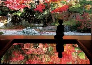 紅葉の時期になると、色鮮やかな「逆さ紅葉」が期間限定で一般公開されます。この時期、お寺では広間の畳を一部はがしてアクリル板をはめ込み、庭園の紅葉を逆さに移るように仕掛けを施します。その景色はまさに、切り取られた絵のように美しく、訪れた人たちを楽しませます。