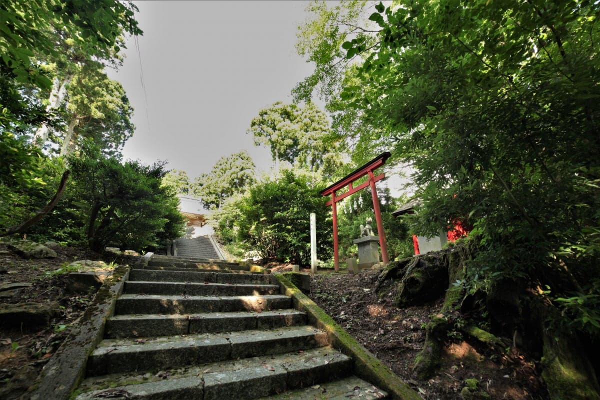 神社の入口から、まるで天へ続くような約150段の階段を登ったところに社殿があります。社殿の横には遥拝所があり、神武天皇が即位された地(奈良県)の橿原神宮(かしはらじんぐう)へ向けて礼拝することもできます。