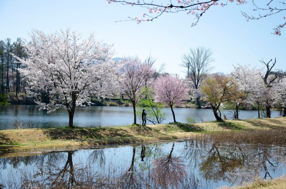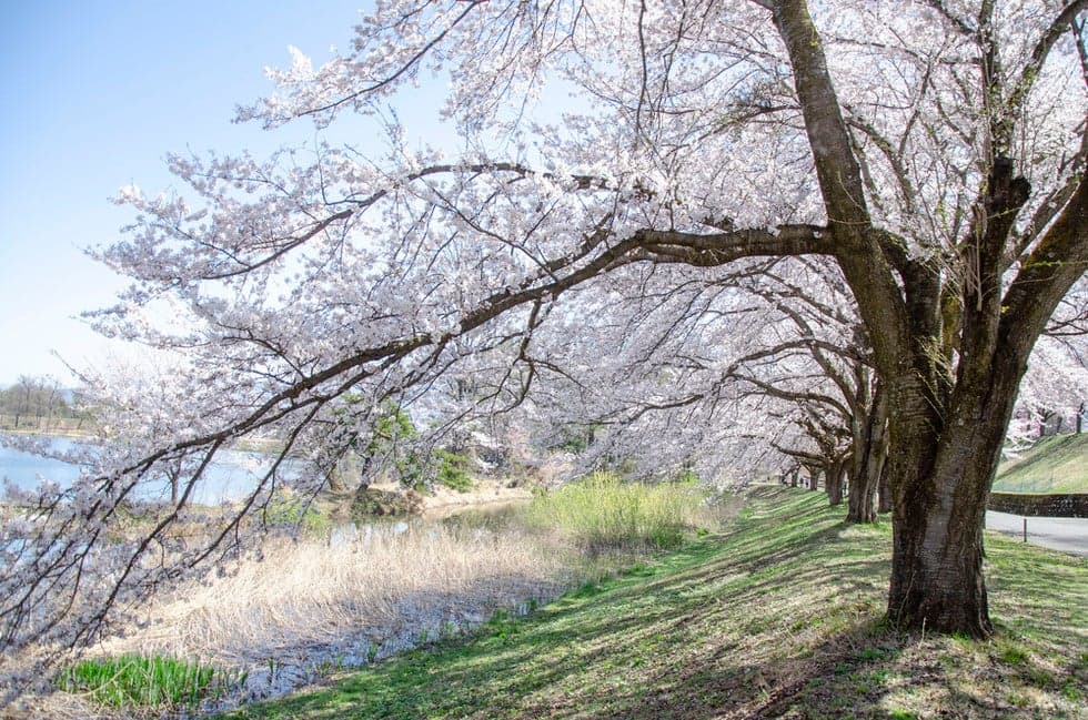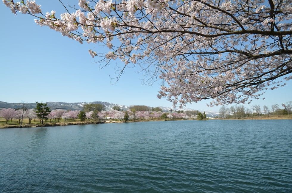 公園内にある「針湖池」や芝生を囲むように約550本のオオヤマザクラやソメイヨシノが並びます。例年の見頃は4月下旬~5月上旬。(異なる種類によっては5月中旬まで見ることができる)