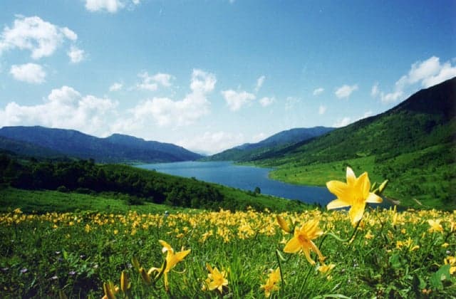群馬・長野・新潟3県の県境に位置する野反湖。湖面標高1,513m、水深25m、周囲12kmのダム湖であり、周囲を2,000m級の山々に囲まれた「天空の湖」とも呼ばれています。湖水は信濃川系に属し、日本海に注いでいるほか、夏にはニッコウキスゲなど300種類以上の山野草が湖畔を彩ります。花畑をぬってのハイキングは気分爽快。陶芸やリース作りなどの手作り体験も楽しめます。