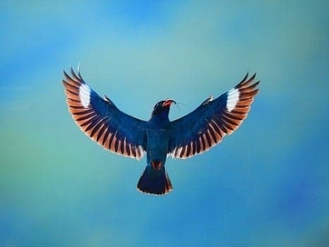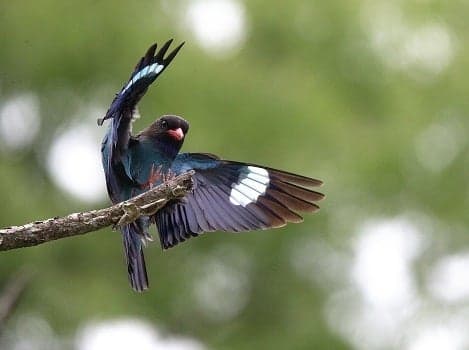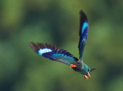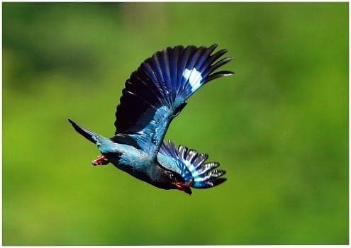 村鳥、県の天然記念物。夏鳥として村に飛来します。赤い口ばしが特徴で、青緑色の羽根が美しく、翼を広げると斑点が目立ちます。村外からはブッポウソウを観察しようと大勢の方が訪れます。